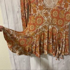 Description: adorable floral tunic top with long sleeves, a mock neck, and a cut out on the back.