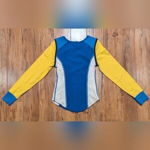 Excellent condition women's medium We the Free colorblock long sleeve Tee. Ribbed material. Blue, white, yellow, & black in color. Georgous statement piece to add to any outfit. Ribbed throughout except on sleeves.