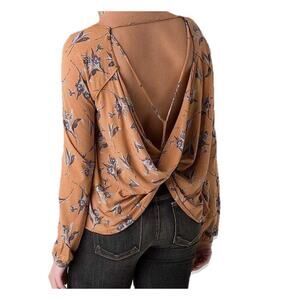 The product is a Free People Fanta blouse in a size medium, featuring a floral pattern with an open back design. Made of a blend of modal and cotton, the top has long sleeves and a round neckline, making it suitable for casual occasions. The relaxed fit and bohemian style make it perfect for the fall season. This designer piece is versatile and can be worn for various events, adding a touch of preppy sophistication to any outfit.