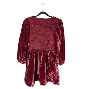 Femme and flattering, this mini features a soft velvet fabrication and fit-and-flare style with a smocked bodice and balloon sleeves.