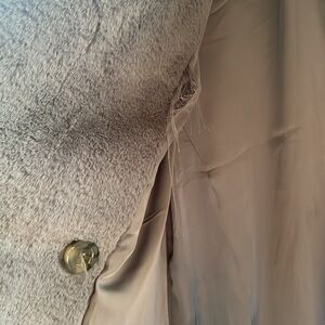 I wore this jacket maybe three or four times and it is super warm! It has a Polyester Lining. It is missing one button on the left top side (as seen in pictures) but it is underneath so not noticeable. I do have the button in the pocket of the jacket-I’m just not a thread & needle gal. lol! There are a couple of small rips on inside lining (see pics). There are no stains.