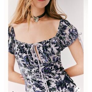 Features: Soft velvet fabrication, floral print all over, scoop-neckline with tie detail, gathered cap-sleeves with contrast ties, scoop-back detail