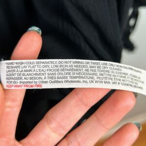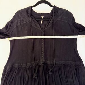 Free People Feelin Moody Mini Dress in black. This long sleeve flowy boho whimsigoth witchycore dress features an easy, oversized fit with pretty lace details throughout. Sophisticated tie neckline with exposued front buttons, tasseled ties at sleeve cuffs. Made of a sheer and flowy gauze fabric that allows you to layer this over a swimsuit or with a slip. Women's size S small, relaxed fit, measurements pictured. Very good used condition, one small snag near buttons shown in final photo.