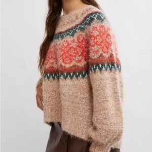 Free People oversized cozy knit sweater with vibrant patterns. Features a mix of red, green, and tan hues. NWT