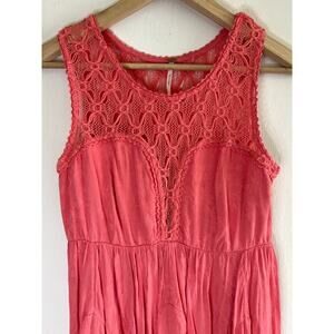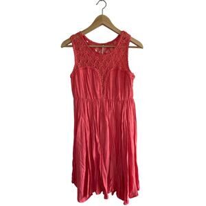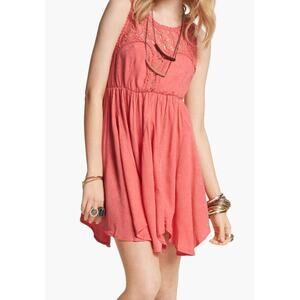 An easy, handkerchief hem furthers the effortless boho vibe of a romantic babydoll dress embellished with peekaboo crochet work at the bodice. The bodice's delicate knit trim offers a handmade feel, while an asymmetrical hem creates an airy look. Gentle pleats at the elastic waist add a comfortable, flattering finish.