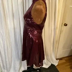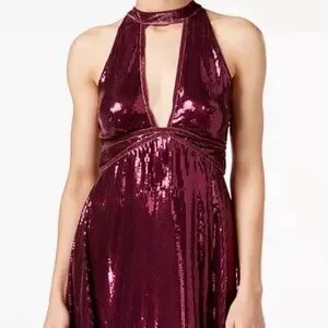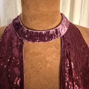Dazzle in this deep purple sequin dress. Backless design with halter neckline. Perfect for evening events. Velvet collar and ribbon detail around waist. You will be the most stunning girl twirling around the dance floor at the club in this pretty sparkly dress.