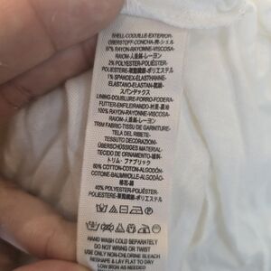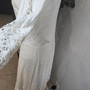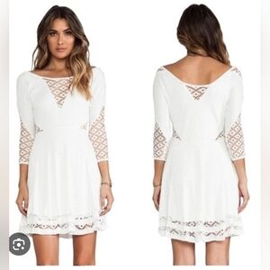 This stunning white dress by Free People features a flattering fit and flare silhouette with a scoop neckline, perfect for wedding guest or cocktail occasions. The 3/4 sleeves add a touch of elegance, while the intricate lace detailing provides a romantic and feminine aesthetic.