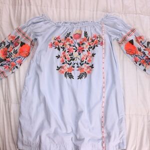 Free People Fleur Du Jour Light blue Embroidered dress. Lightweight woven cotton with vibrant orange pink and beige floral embroidery shapes an elasticised off-the-shoulder neckline and three quarter sleeves with elastic cuffs. Breezy shift sillhouette with side seam pockets. 100% cotton. Size XS