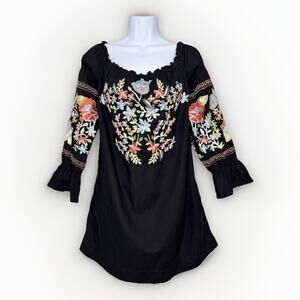 Free People Fleur Du Jour Floral Embroidered Off Shoulder Mini Dress Sm Black
