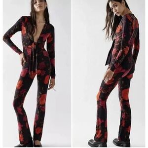 Turn heads in this so cool catsuit featured in a floral printed, fitted design with deep V-neckline and front tie detail for added dimension.