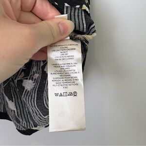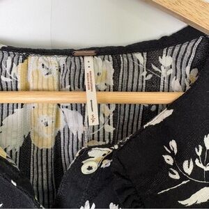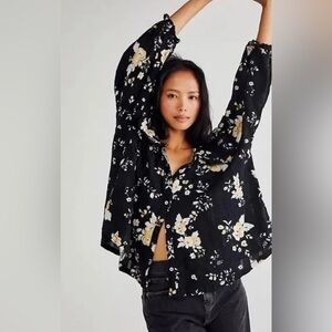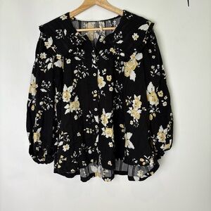 Stunning button down top with peter pan collar and puff sleeves. Black with white and yellow floral print. Relaxed fit. Size small. About 25 inches from pit to pit laying flat. About 23.5 inches long in front and 25 inches long in back. Excellent condition with no defects.