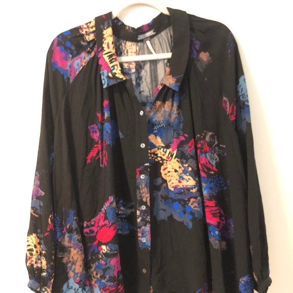 Quintessential Free People top with stunning bold pattern against black backdrop. Button front with modified Peter Pan collar. Can be worn alone or layered, as well as creatively restyled. Free people is known for its oversized look. This is an extra small but fits up to a large.