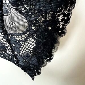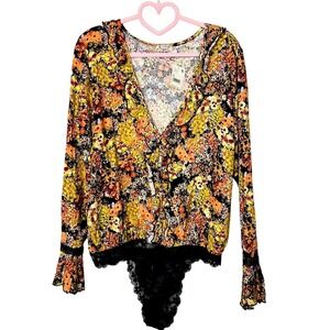 Vibrant floral bodysuit. Long sleeves with ruffle cuffs. Deep V-neckline. Perfect for casual outings.