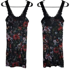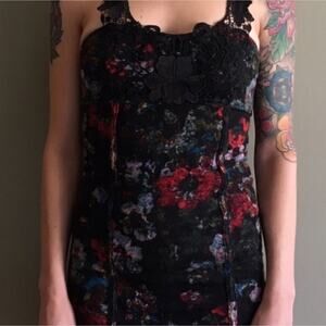 Sexy bodycon fitting with dark floral patterns and lace accents.