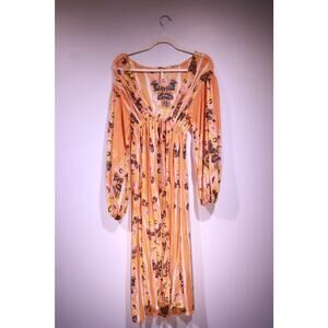 his stunning Free People midi dress features a vibrant floral print in a warm peachy-orange base with pops of yellow and pink. The relaxed, bohemian silhouette includes long flowy sleeves, a deep v-neckline, adjustable tie at the waist, and a breezy midi length. Lightweight and partially sheer, it’s perfect for festivals, brunch, or a beach vacation.