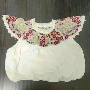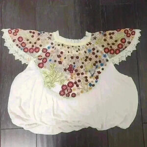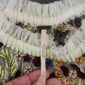 Free People Bubble hem sheer floral top, Shoulders, chest and upper back is sheer and embroidered. Ruffled around collar.