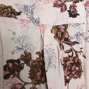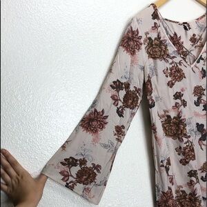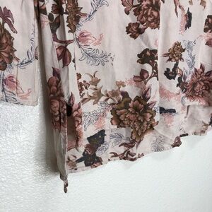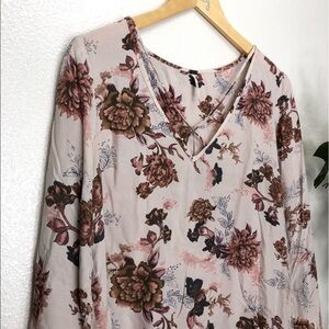 A beautiful light pink blouse with dark floral accent details. Loose fitting slight bell sleeves and a criss cross v cut chest. Slightly shorter in the front, square cut bottom. Thin and soft material