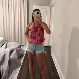 Silk halter bodysuit with cross detail in back. Super comfortable and perfect for summer! Worn twice!