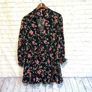 Free People Floral Long Sleeve Dress Sz S Black/pink Lighten Up Mini Tie Waist