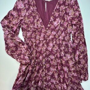 Elegant long sleeve dress with floral pattern. Features a deep V-neck and flowy silhouette. Perfect for any occasion.