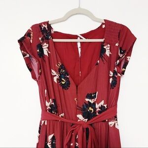 Free People floral dress. Layered construction. Hook and eye enclosure at front. Button detail at back. Tie at waist.