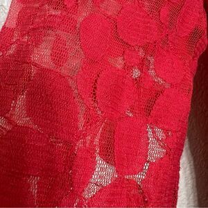 Floral embroidered mesh mini dress with lightly pleated skirt. Slip dress is attached underneath and has adjustable straps. Sleeves and neckline are left sheer. Bottom hem is trimmed with scalloped lace.