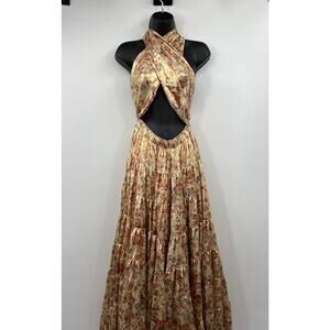 Chic floral midi dress. Halter neck design. Flowing skirt with slit. Perfect for summer.