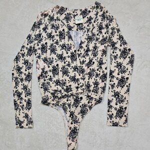 Free People ✦ Floral Print Deep V Bodysuit ✦ Long Sleeve Stretchy Size S NWT