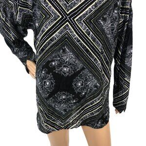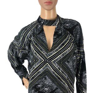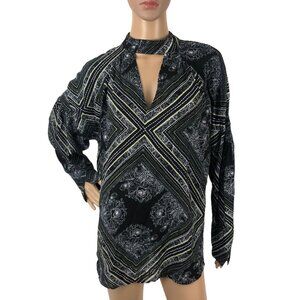 Free People Geometric Floral Print Keyhole Choker Oversized Boho Tunic Top Sweater Blouse Size M Bohemian Festival Gypsy Hippie