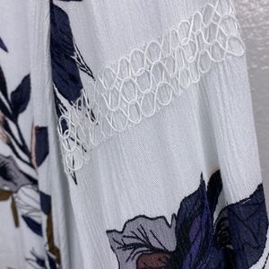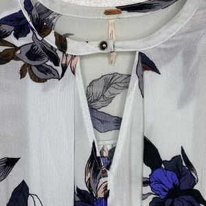 Free People Long Sleeve oversized flouncy blouse. Features elastic cuffs, v neck with strap across, embroidered sleeves, layers and a high low hem. Color is off white with large floral print in blue, brown, pink, grey and black. Relaxed fit so so cute! In excellent condition. Size S