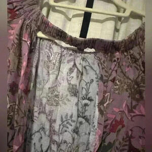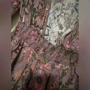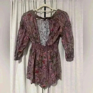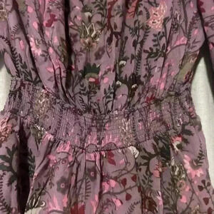 This Free People floral romper in size XS is the perfect addition to your wardrobe for any casual or semi-formal occasion. The soft purple-pink base with intricate floral patterns gives it a boho-chic vibe. Featuring an open back with tie closure, smocked waist for a flattering fit, this romper offers both comfort and style. Made from a lightweight fabric, it’s perfect for spring and summer days. Gently worn and in great condition.