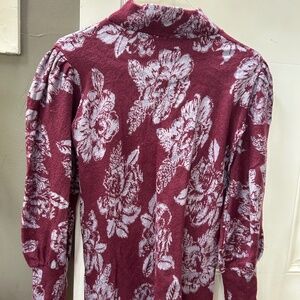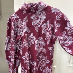 Free People Long Sleeve Plum and Lilac Sweater Dress. Unique size M mini dress with puffy sleeves and shoulders fitted narrow on wrist and forearm. Could be worn as tunic or mini, cute on its own or over jeans/leggings. 80% wool 20% acrylic.