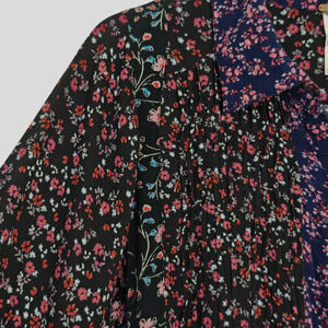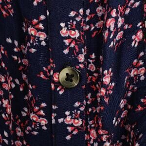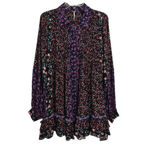 Free People swing tunic mini dress in women's size small. Floral printed viscose fabric. Long balloon sleeves have button cuffs. Collared neckline. Full button front. Layered, ruffle hemline. Pleating throughout for a billowy, romantic look. Metal tag is unsewn at one end - doesn't affect wear.