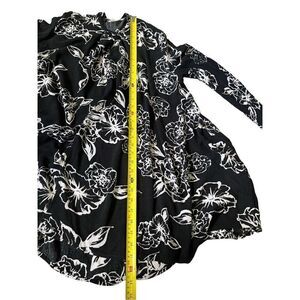 Style: Black with off white/yellow/brown/green floral print pattern, long sleeve with elastic cuff and crochet detail, side pockets, front open keyhole with button closure, pleated, swing style