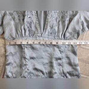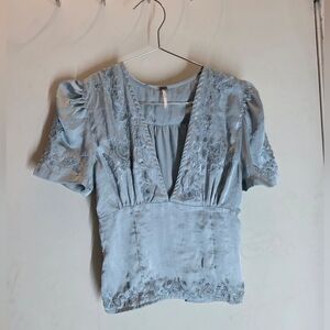This Free People Floral V Neck Top size XS Mint blue color used with a black spot on the neck, the rest is in good condition