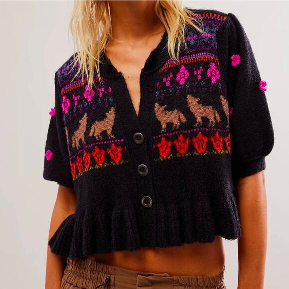Keywords: free People, FP, bohemian, boho chic, wool blend, wolf, dog, floral, jacquard, fair Isle, boxy, relaxed fit, colorful, cropped fit, button front, knit flower applique, 3/4 sleeveles, animals, western, southwestern, cowgirl, outdoors