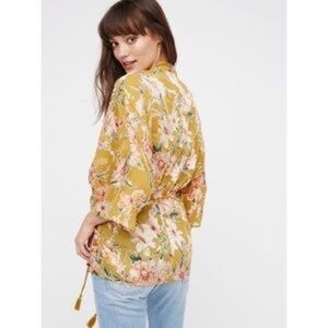 Vibrant floral kimono top. Features a tie front. Perfect for layering.