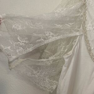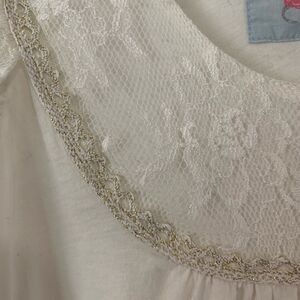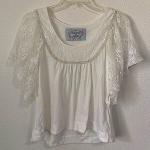 This is one of the prettiest and most feminine FP pieces I’ve found. So lovely with floral lace and metallic stitching around the neck and fluttery lace sleeves. It has a tiny spot(pictured) but is otherwise in excellent condition.