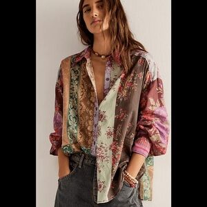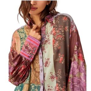 Free People Flower Patch Mixed Media Patchwork Button Down Floral Top