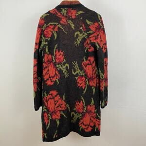 Very warm cardigan with one snap button closure in center. Floral pattern design. Is slightly itchy in my opinion due to the Alpaca and Wool fabric. Has 2 front pockets.