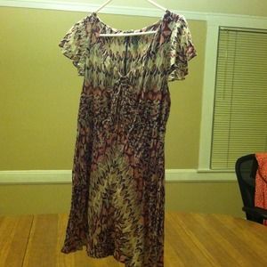Gently pre-loved free people flutter sleeve tunic dress size 10. I purchased this from Nordstrom and it is short so it can be worn as a tunic or as a mini dress. Really pretty floral design with pink/purple/greens!