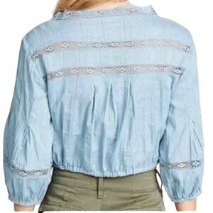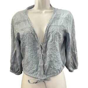 Free People follow your heart blue embroidered floral puff sleeve crop top.