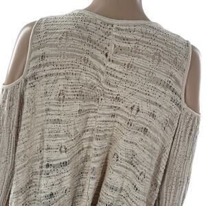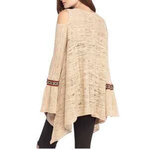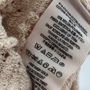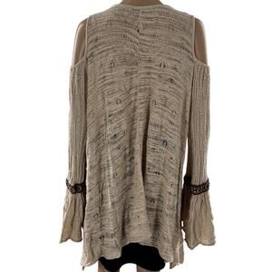 Free People For The Love of Flowers tunic top in the color tea. Apiece of art in the form of a romantic bohemian tunic. Globally inspired trim lines the deep split neckline and fluttery bell sleeves of a loose knit tunic accented with worn in shredded details. Cold shoulders flaunt a little extra skin, while the asymmetrical hem lends a flowy finish to the thoroughly boho chic look. Gauzy crochet knit. Low V neck with drawstring ties and tassel ends. Effortless, oversized fit. Bell sleeves. Asymmetrical hem. Cotton / nylon. Hand wash. OB415727. In preowned condition.