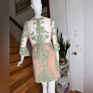 Stun in this sweet mini dress featured in a gorgeous lace overlay fabrication with deep V-neckline and ruffle-trimmed sleeve cuffs.
