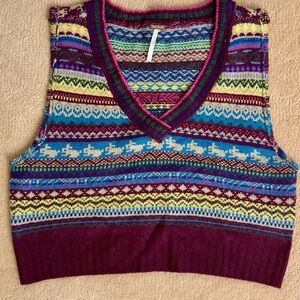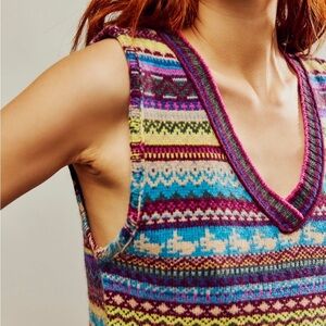 Bold knit tank with vibrant patterns. Features rich burgundy, bright blue, and sunny yellow. Perfect for layering or stand-alone style.