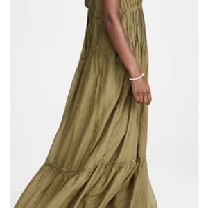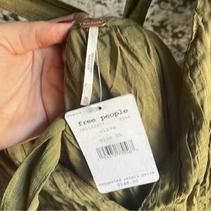 This soft textured sundress by Free People showcases a plunging neckline, with delicate medium straps, complemented by a tiered, ruffled skirt. Its vibrant olive green hue and pleated design make it perfect for any wear, offering a breezy and stylish look. It also features a side zip.