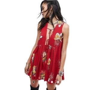 The Free People Lovely Day Red Floral Print Dress will make your day! Breezy woven fabric, features a pretty purple, rust, blue, and white floral print as it falls into a deep V-neckline, with two sets of ties, and a wide-cut, swing silhouette. Back cutout accented with gunmetal ring.