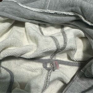 Features: Hood detail; zip-front neckline; side pockets; dropped armholes; raw hems; defined seaming throughout