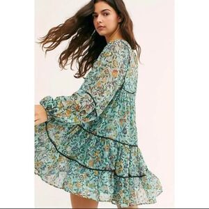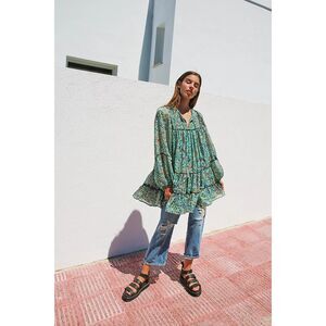 Designed in a gorgeous print fabrication with metallic thread accents, this ruffle tiered mini dress is featured in a shapeless, long sleeve silhouette.