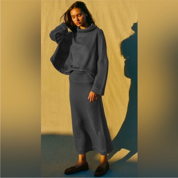 Free-est by Free People “Miley” two-piece set in a versatile gray. Features a relaxed fit long-sleeve sweater with a high neckline and super cropped back and matching midi-length skirt. The top offers a cozy, draped silhouette, while the skirt has a comfortable elastic waistband for an easy fit. Perfect for lounging at home or styling for casual outings.